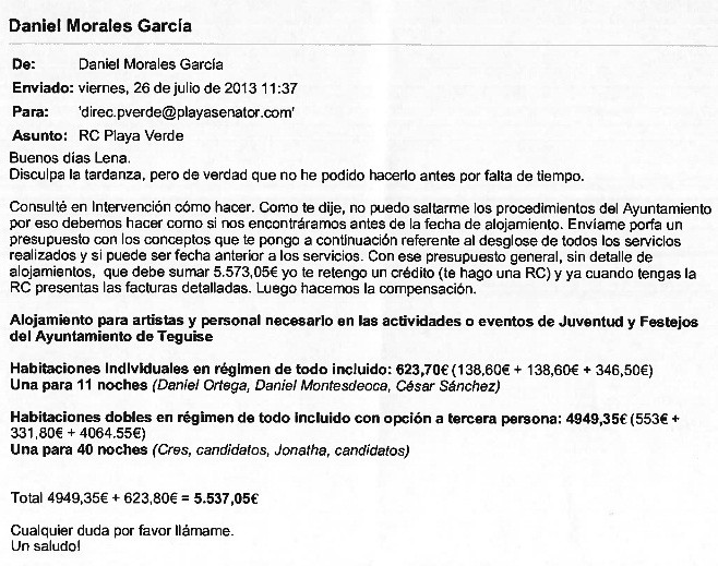 El concejal de festejos de Teguise, Daniel Morales (CC) pidió al Hotel Playa Verde que simulase un presupuesto de 5.500 euros por alojamientos a cargo del Ayuntamiento cuando ya se había realizado el gasto.
