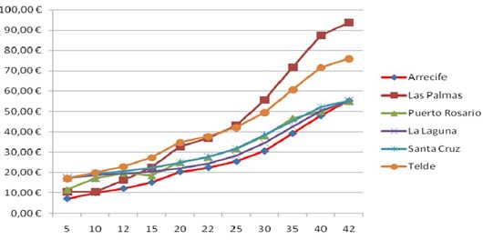 Así, la factura por 15 metros cúbicos en Arrecife es de 15,1 euros, en Puerto del Rosario es de 18,5 euros, para aumentar hasta los 20,4 euros en La Laguna, los 22,3 en Santa Cruz, los 22,4 euros en Las Palmas o los 27,2 euros en Telde.