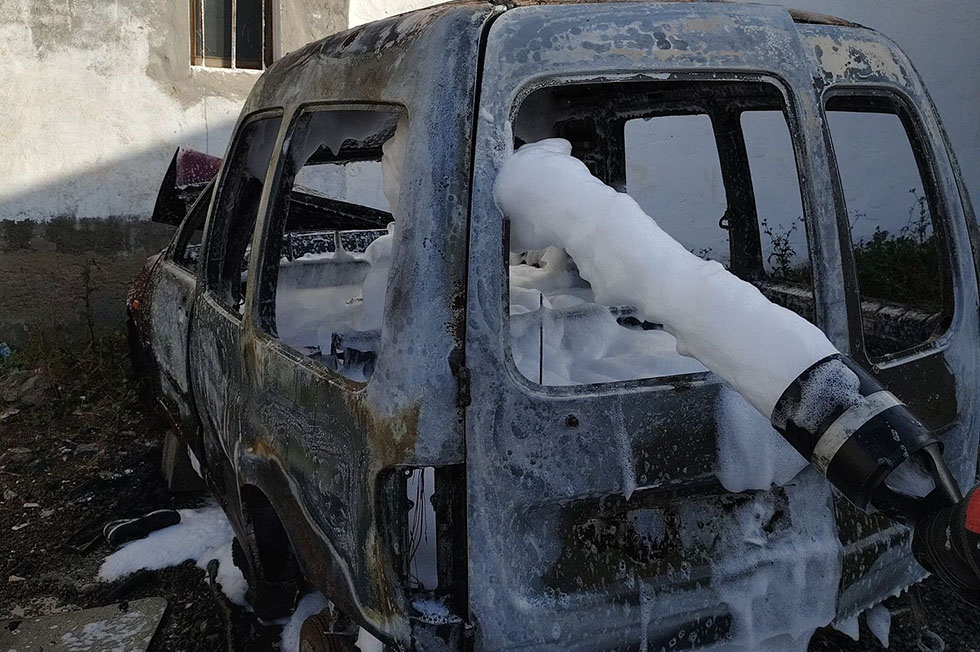 Los bomberos comprobaron que el fuego afectaba a un vehículo sin ruedas que ardía casi en su totalidad, procediendo a su extinción mediante la aplicación de agua con aditivo y espuma.
