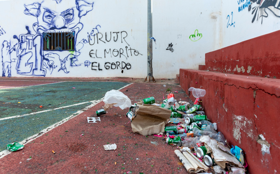 En el campo colindante, con las vallas completamente rotas, la cancha acoge a tres jóvenes jugando a la pelota. Uno de ellos hace de portero mientras que los otros dos se enfrentan entre sí para meter un gol en una portería con las redes destrozadas.