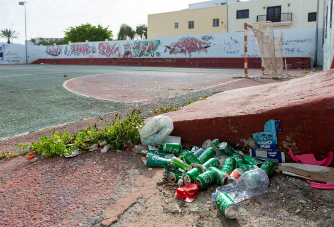 Un poco más arriba, a espaldas de la Sociedad de Altavista, se encuentra una cancha de fútbol sala en la que el blanco impoluto que se aprecia en la parte externa de sus paredes contrasta con los numerosos grafitis y la basura que hay en su interior. Pero ese no es el verdadero problema: la cancha se encuentra impracticable y evidentemente vacía. Numerosos trozos pequeños de cristal se distribuyen a lo largo del rectángulo de juego y suponen un grave peligro para cualquier joven o niño que quiera practicar el deporte del balompié.