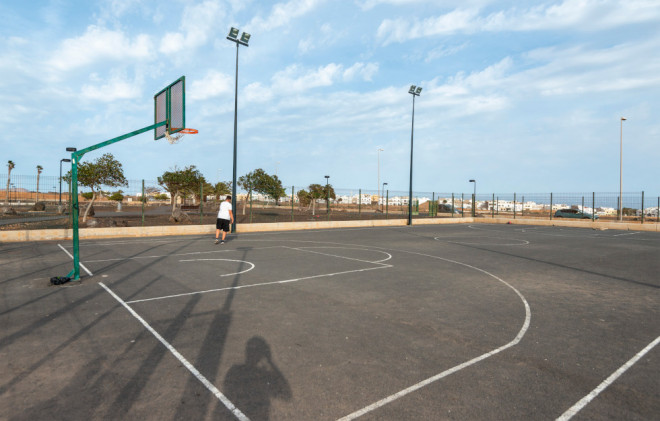 La siguiente parada es el barrio de Los Geranios, donde se encuentra la única cancha pública de baloncesto mini de la capital, ubicada enfrente del centro sociocultural. Un recinto deportivo frecuentado a lo largo del año y especialmente en verano incluso por algún club de la Isla y que en la actualidad cuenta con dos canastas y tan solo un aro que se encuentra destrozado. En definitiva, una cancha en la que no se puede jugar al baloncesto y sobre la que el Ayuntamiento capitalino acaba de anunciar obras pese a que solo han cambiado la valla exterior.