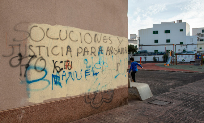 Al mismo tiempo, varios niños castigan las viejas paredes del recinto con dos balones de fútbol. Parece que, ante la imposibilidad de jugar un partido, emprenden su marcha. “Vamos pa’l CEO” -Argana-, propone uno. La pequeña cuadrilla se dispone a marcharse hasta el centro público donde tendrán que saltar unas paredes para jugar a la pelota. Lo que es evidente es que en este abandonado Palacio de Deportes no se puede jugar.