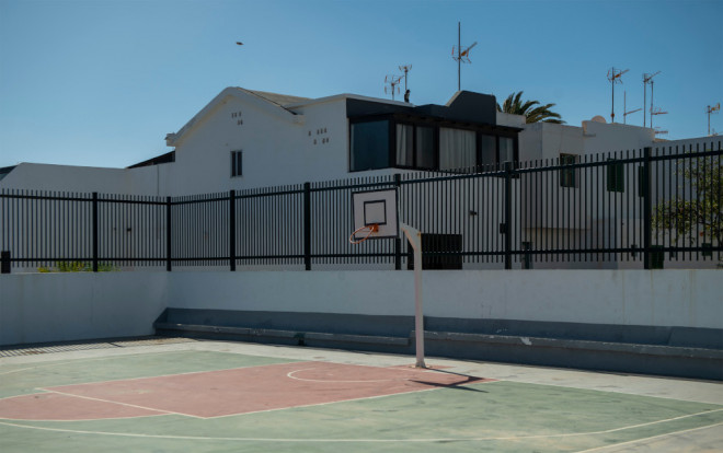 Exteriores del pabellón de Argana, con una canasta rota colgada de la pared.