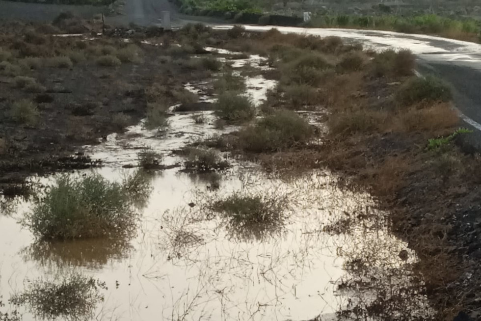Las imágenes muestran el estado del carretera entre Tegoyo y La Asomada esta misma mañana después de que se produjera una rotura en la tubería de conducción de Canal Gestión Lanzarote, vertiendo miles de litros de agua.