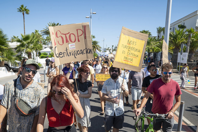 Los manifestantes increpaban o aplaudían, sin más. Los turistas grababan con sus móviles o giraban la mirada desde la playa al paso de la manifestación, donde también se han coreado consigas y portado carteles en inglés como ‘Our water is in your pool’ o ‘Digital nomads, go home’. A la manifestación, además de varios colectivos y personas a título particular, se han sumado representantes de la Fundación César Manrique y del PSOE insular.