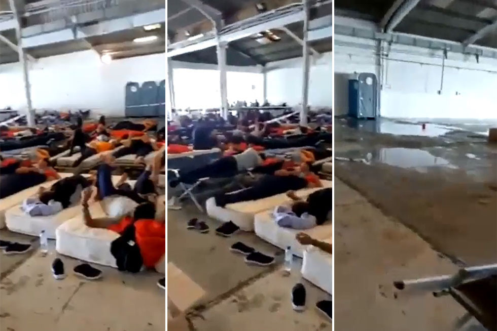 En las mismas se aprecia a una gran cantidad de personas en el interior de una nave, en colchones sobre el suelo. En las instalaciones apenas hay unos baños portátiles pero la edificación carece de duchas y de agua corriente.