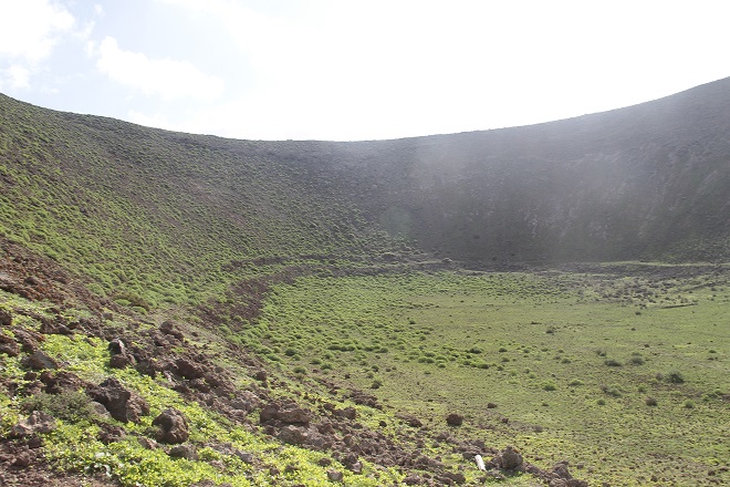 El punto de contacto de este malpaís negro y los impertérritos islotes (blancos-amarillentos) se hace todavía más evidente con las últimas lluvias. La hierba de un verde fluorescente (que parece más propia de pastizales asturianos pero que es un regalo de esta tierra arcillosa y volcánica) marca la frontera donde la lava cambió de rumbo en el siglo XVIII, viéndose obligada a rodear las antiguas moles de Caldereta y Caldera Blanca para seguir avanzando lentamente hacia el mar.