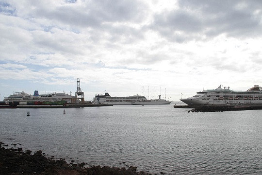 Es jueves de crucero. Cinco grandes buques atracan en el Puerto de Los Mármoles y otorgan a Arrecife un atributo de fiesta y reverberación comercial. Los pasajeros del Oceana, AidaBlu, M.S.C Armonía, Thomson Spirit y Wind Surf caminan por la ciudad, pequeñita en comparación con las escalas que han hecho en su tour.