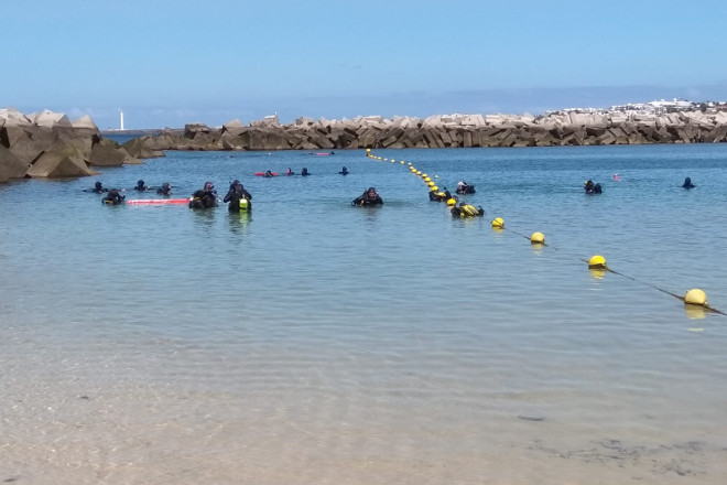 Una vez en la playa, una quincena de buzos se sumergieron en las aguas de Flamingo para retirar los desechos acumulados en sus fondos, como latas, botellas, palos y hasta una hamaca, entre otros enseres, mientras que el resto de voluntarios se repartieron por grupos realizando una profunda batida por la zona tierra, que incluyó la zona de rocas, paseo marítimo, jardines cercanos y playa, rescatando infinidad de papeles, plásticos, colillas, hierros y un largo etcétera de desechos que en caso de no retirar acabarían también en nuestras aguas.