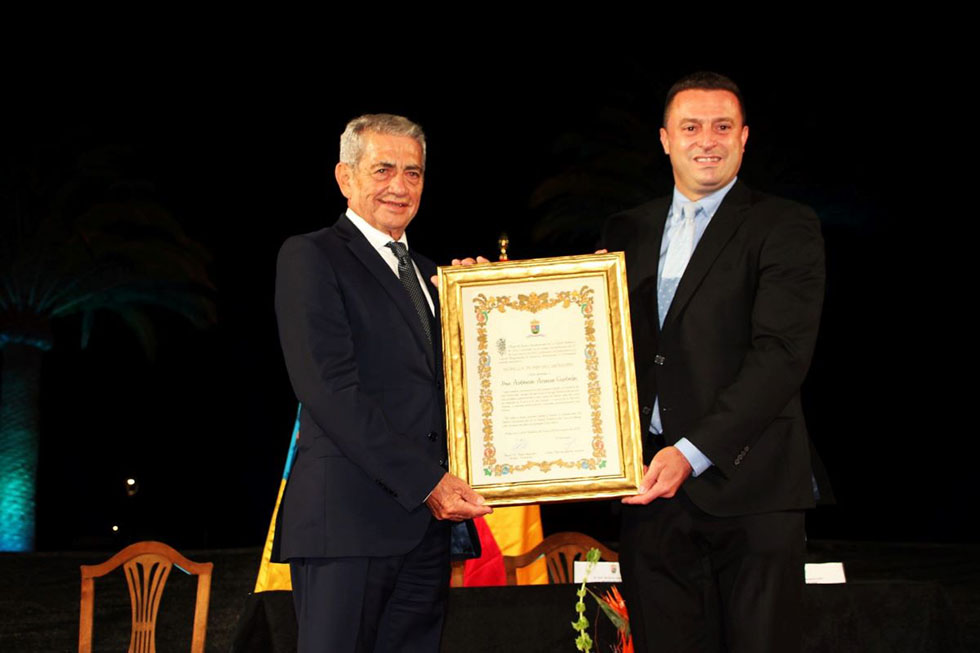 Antonio Armas Fernández recibió en octubre pasado de manos del alcalde de Yaiza la Medalla de Oro, a título póstumo, a Don Antonio Armas Curbelo, yaicero de nacimiento y de corazón quien fuera creador de Naviera Armas hace 80 años e impulsor del desarrollo de una empresa que desde entonces se marcó el ambicioso e ilusionante objetivo de unir por mar el fragmentando territorio canario.