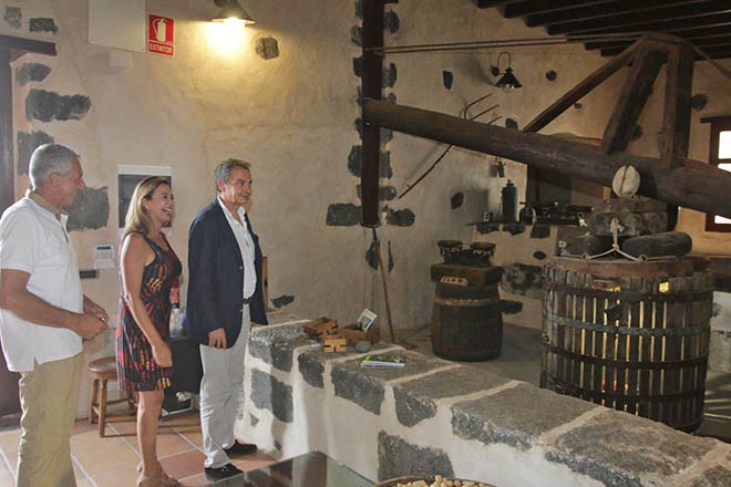 Antes del comienzo del acto y acompañado por la secretaria general del PSOE de Lanzarote, Dolores Corujo y por el propietario de la bodega La Florida, Ginés González Viera, el expresidente recorrió la finca, que se encuentra en plena vendimia y pudo conocer los detalles del peculiar cultivo de la viña en La Geria.